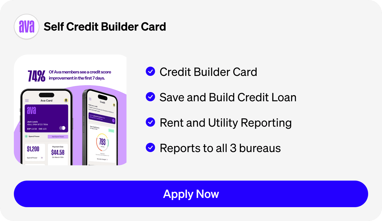 Ava se adapta a los usuarios que prefieren las herramientas financieras basadas en aplicaciones. El enfoque reduce las barreras iniciales y atrae a las personas que desean una opción que priorice lo digital. Además de la tarjeta Credit Builder de Ava, también ofrece informes sobre préstamos, alquileres y servicios públicos. El 74% de los miembros de Ava ven una mejora en su calificación crediticia en menos de 7 días.
