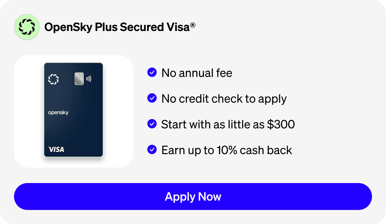 - OpenSky Plus Secured Visa®: depósito mínimo de 300$, cuota anual de 0$, recompensas de hasta el 10%